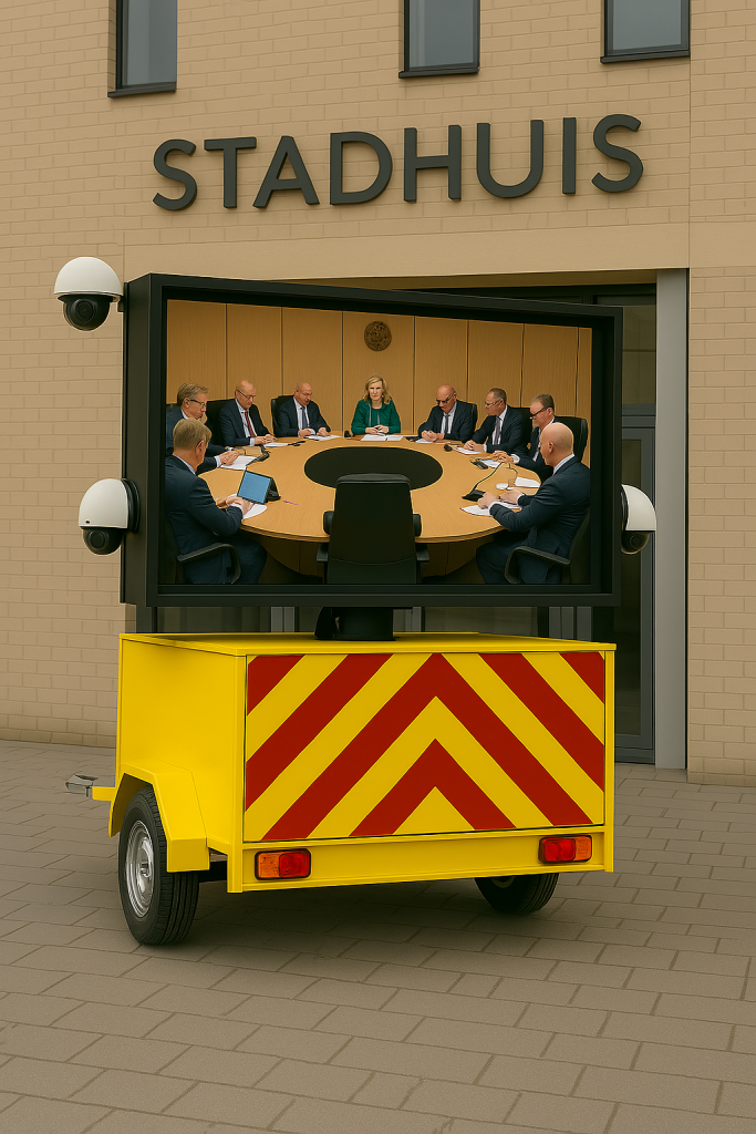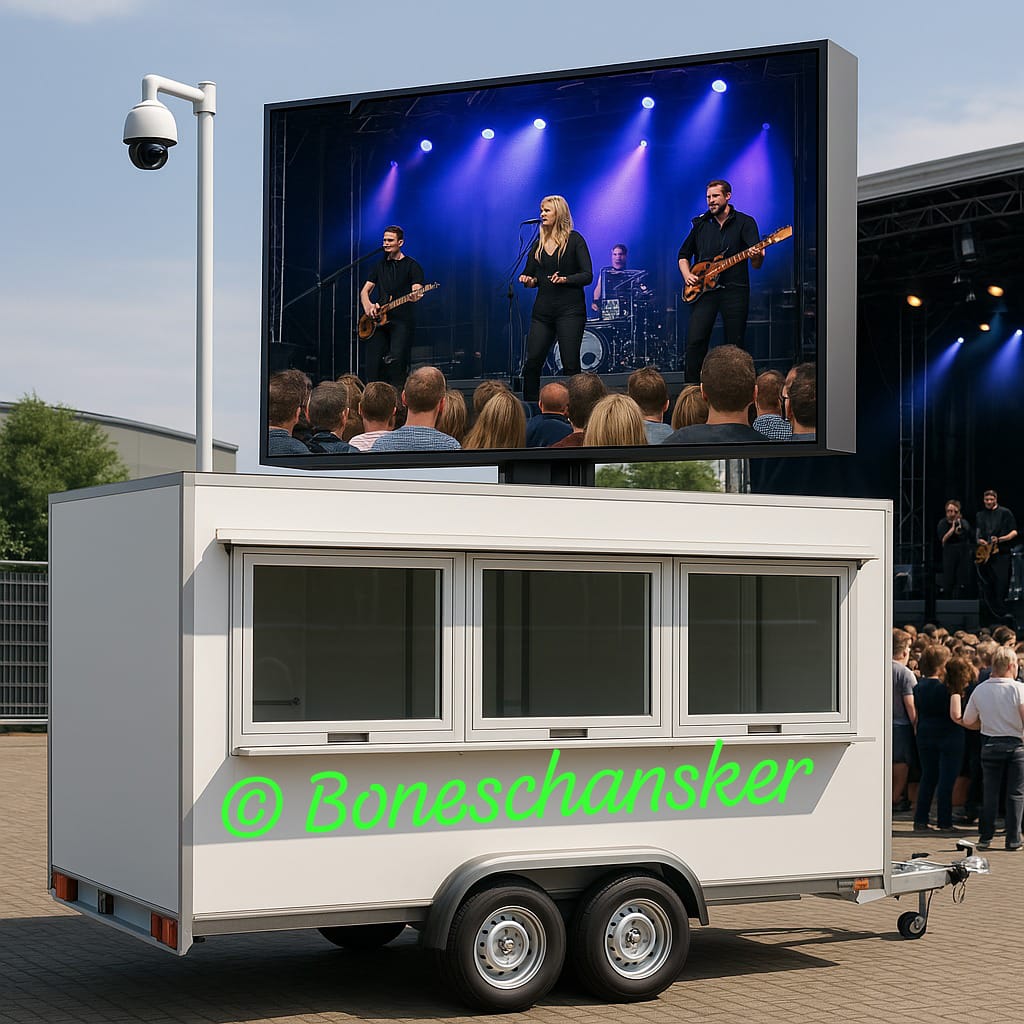 Een multifunctionele video regiewagen ontworpen voor live-evenementen zoals popconcerten, festivals, gemeentelijke bijeenkomsten en wegwerkzaamheden. Deze aanhangwagen is uitgerust met een groot LED-scherm, domecamera’s voor 360-graden bewaking en bedieningsmogelijkheden, en beschikt aan de zijkant over een luik met kassaramen.